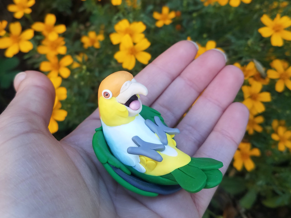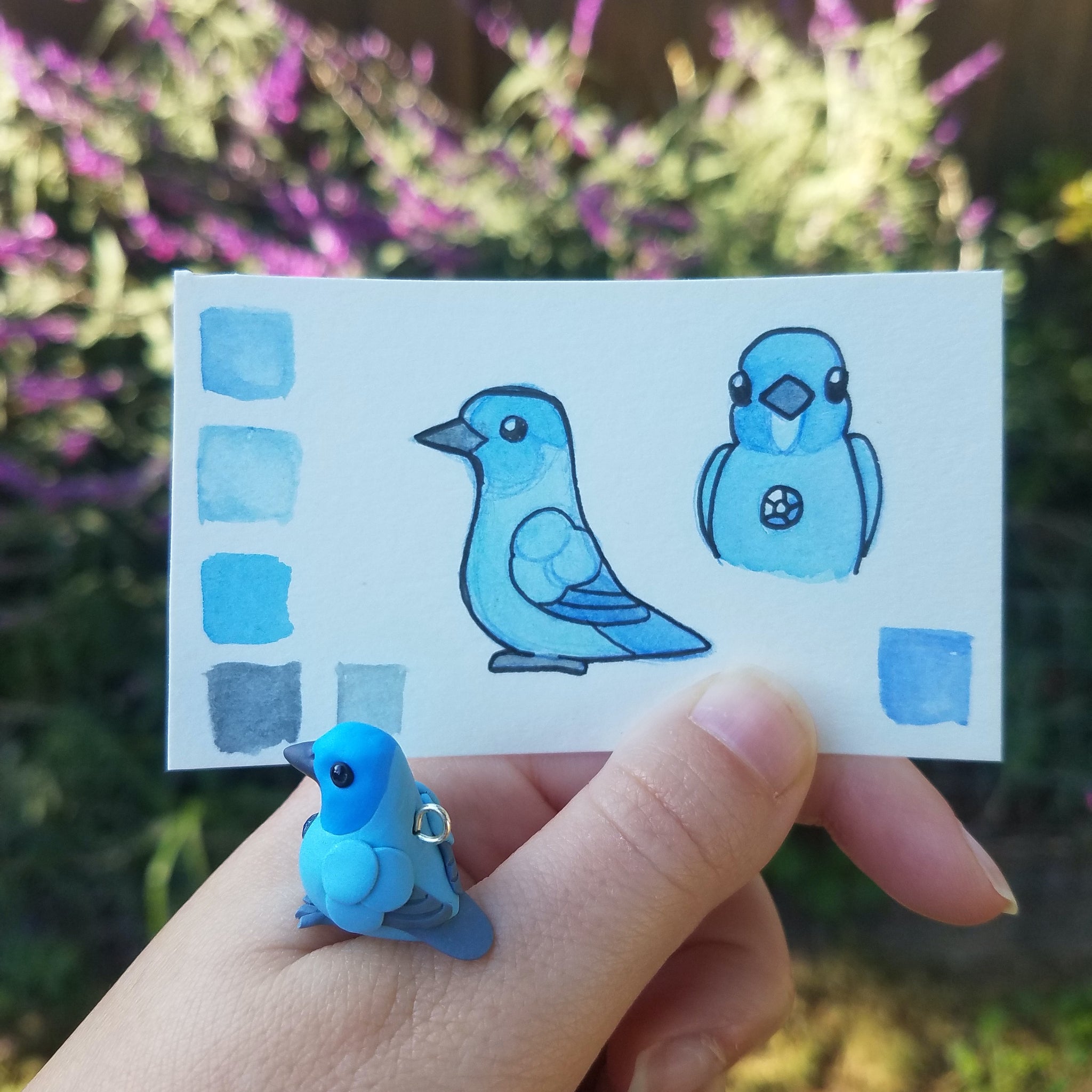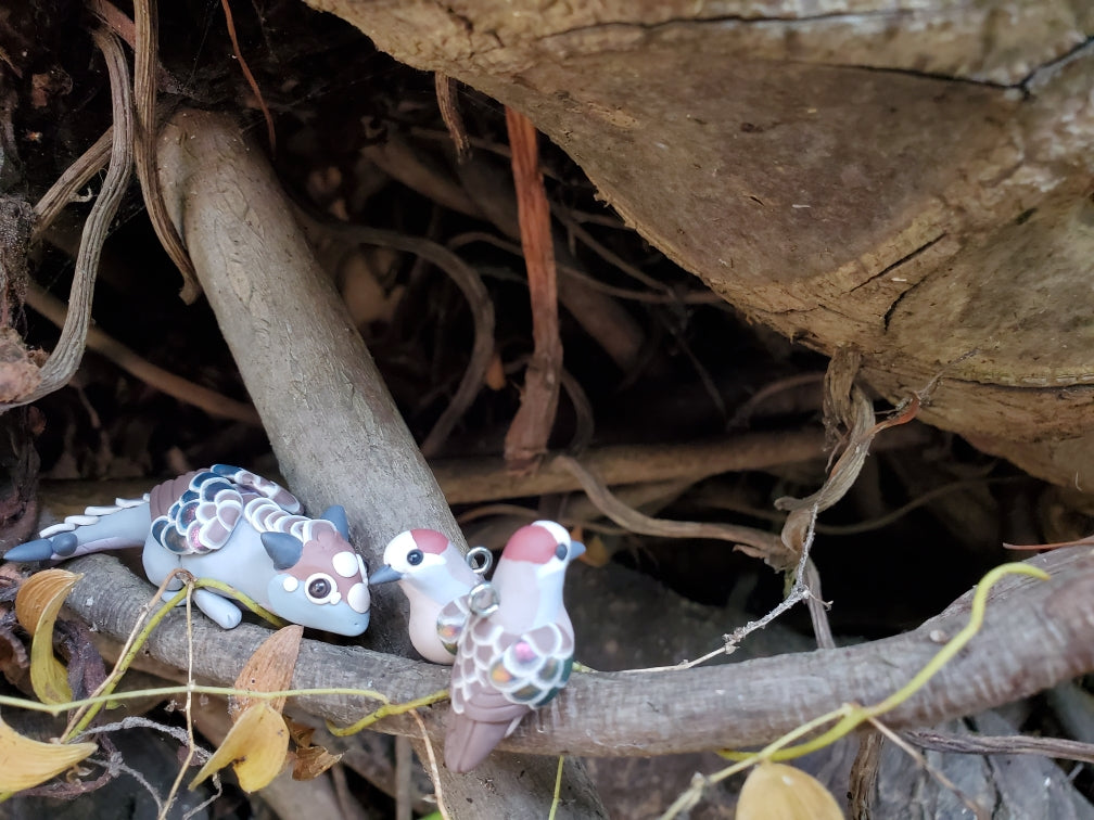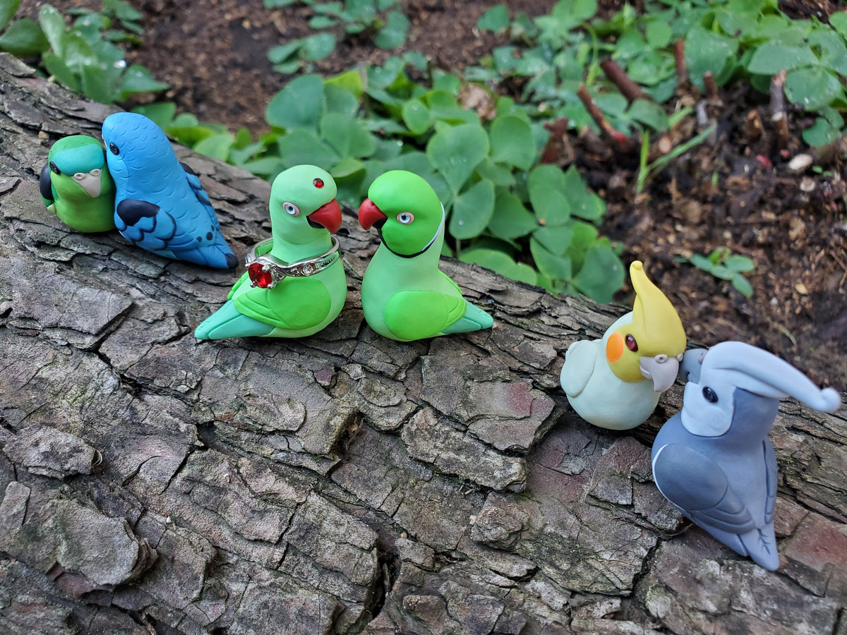 Celebrate the bond with a beloved pet, or miniaturize your favorite bird in nature. Each miniature is handmade from polymer clay, wire, and resin. They are weather resistant and reasonably durable, though I recommend you treat them with care.