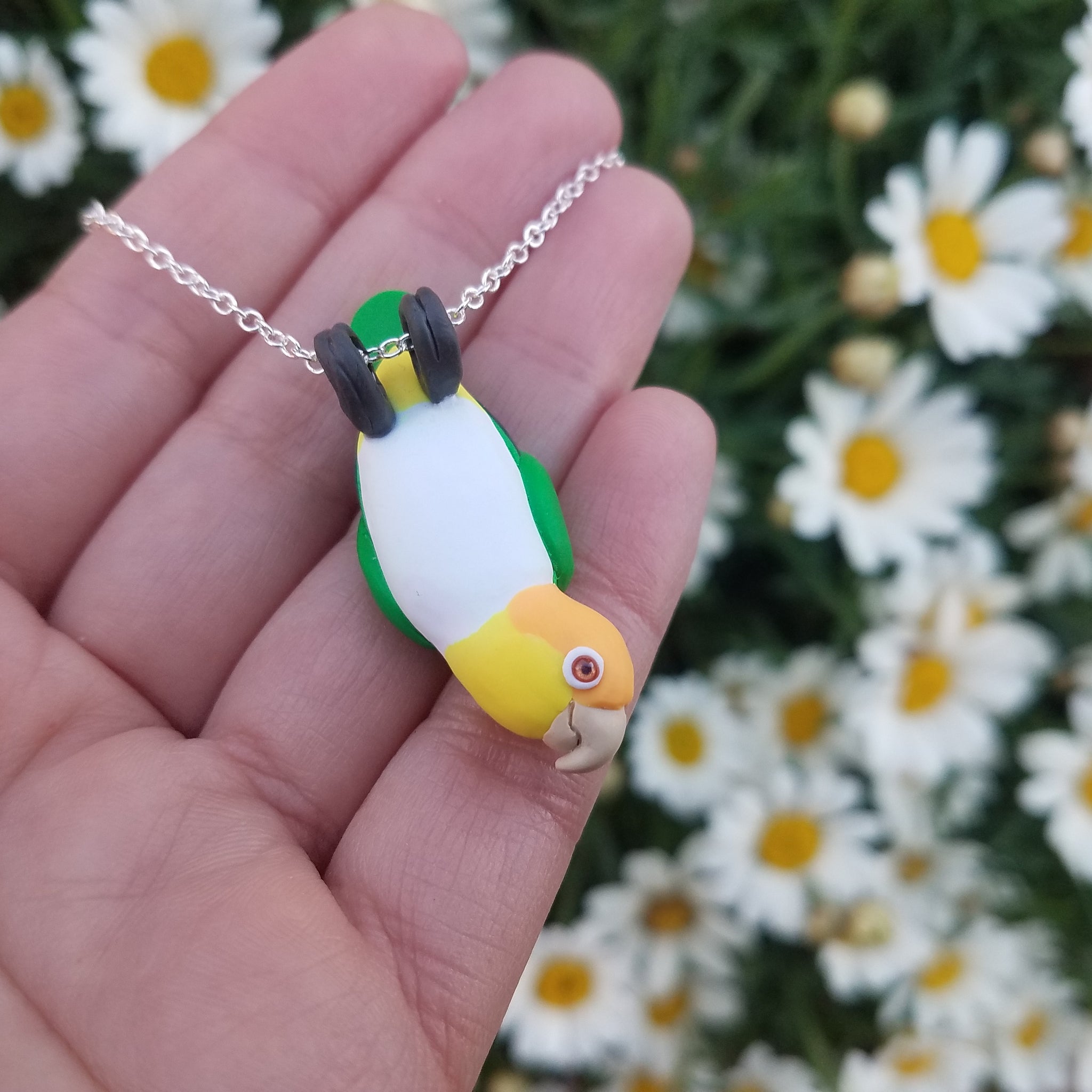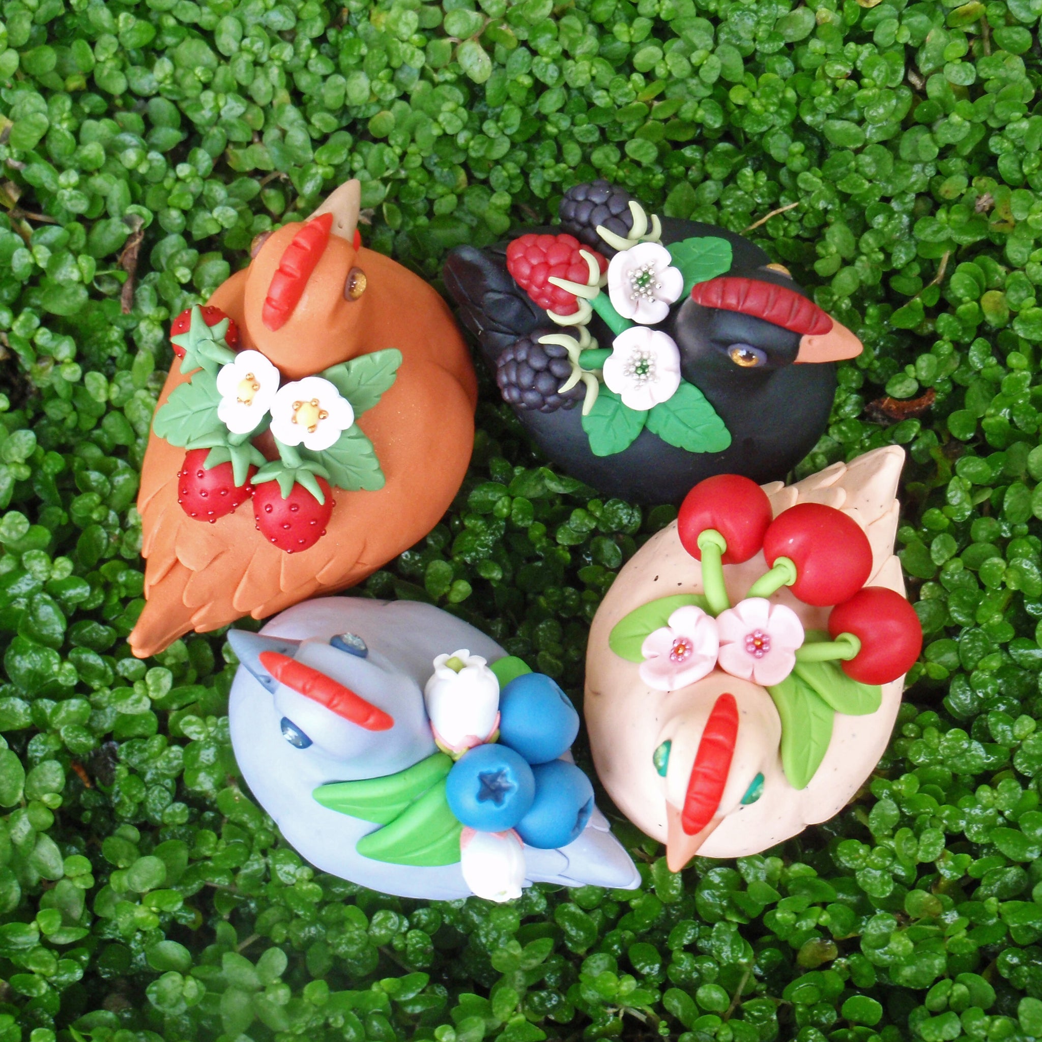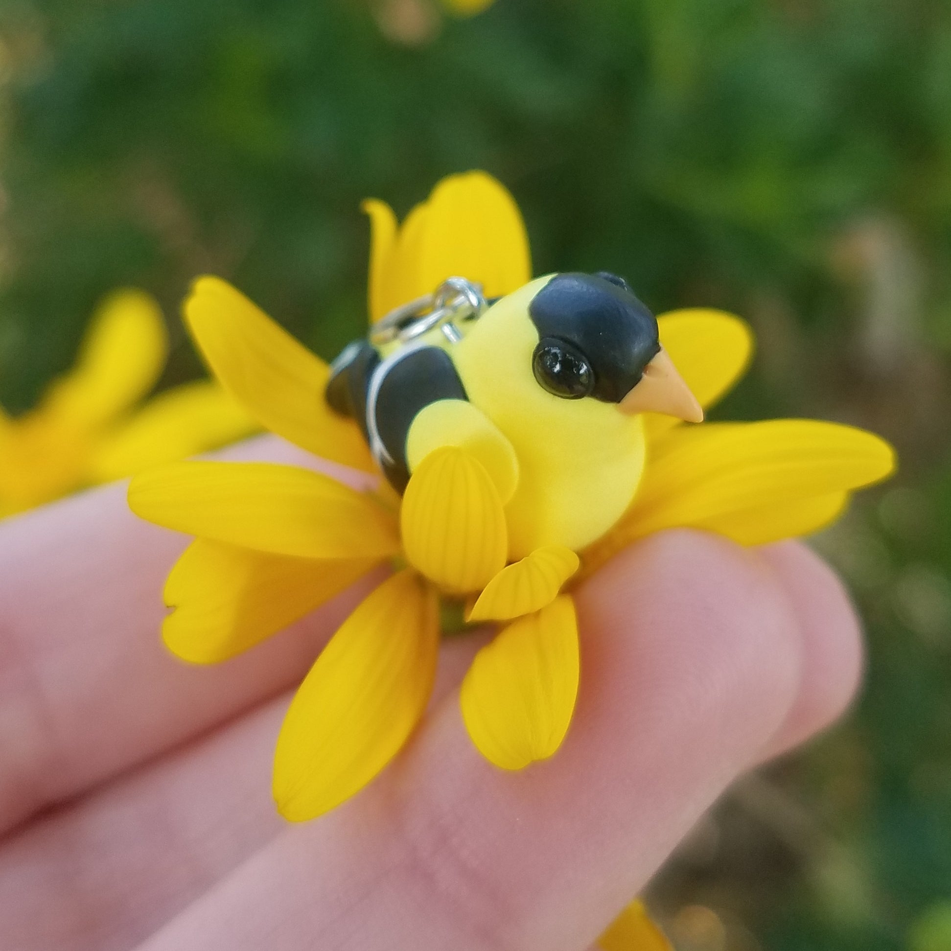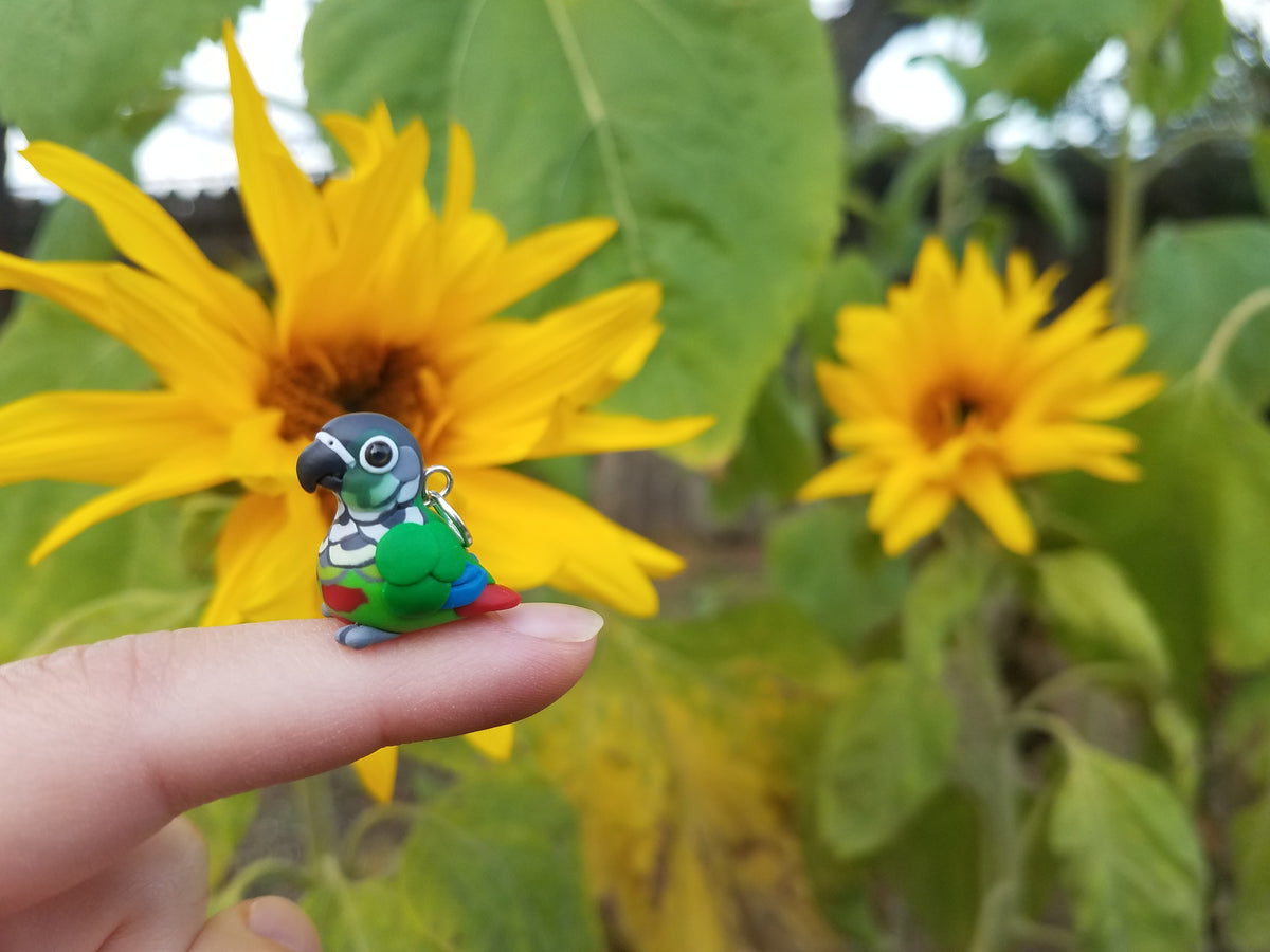 Celebrate the bond with a beloved pet, or miniaturize your favorite bird in nature. Each miniature is handmade from polymer clay, wire, and resin. They are weather resistant and reasonably durable, though I recommend you treat them with care.
